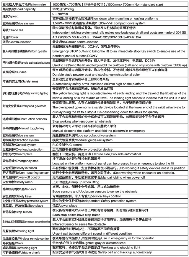 斜掛式無障礙升降平合按其運(yùn)行方向分曲線型和直線型二種。直線型多采用齒輪齒條式驅(qū)動(dòng)機(jī)構(gòu),沿樓梯做上升和下降,只能作直線運(yùn)行不能轉(zhuǎn)彎,傾斜角一般不大于35度,適用于樓層較低、中間沒有水平段的直線型樓梯。曲線型采用繩球鏈?zhǔn)絺鲃?dòng),不僅能做上升和下降,還能水平、轉(zhuǎn)彎和螺旋形運(yùn)行,適用范圍較為廣。該設(shè)備為乘坐輪椅的殘障人員上下樓梯提供了便利,現(xiàn)被廣乏地應(yīng)用在家居住宅和公共場(chǎng)所的樓梯上